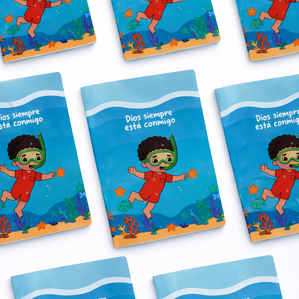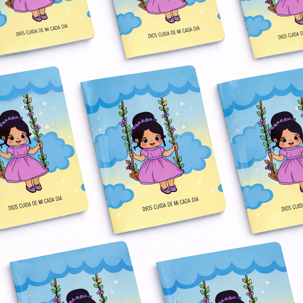 Cuaderno con diseño dulce y encantador, protagonizado por una niña en un columpio rodeado de nubes y flores. Incluye la frase “Dios cuida de mí cada día”, transmitiendo paz, fe y alegría. Ideal para uso escolar o personal con un toque tierno y especial.