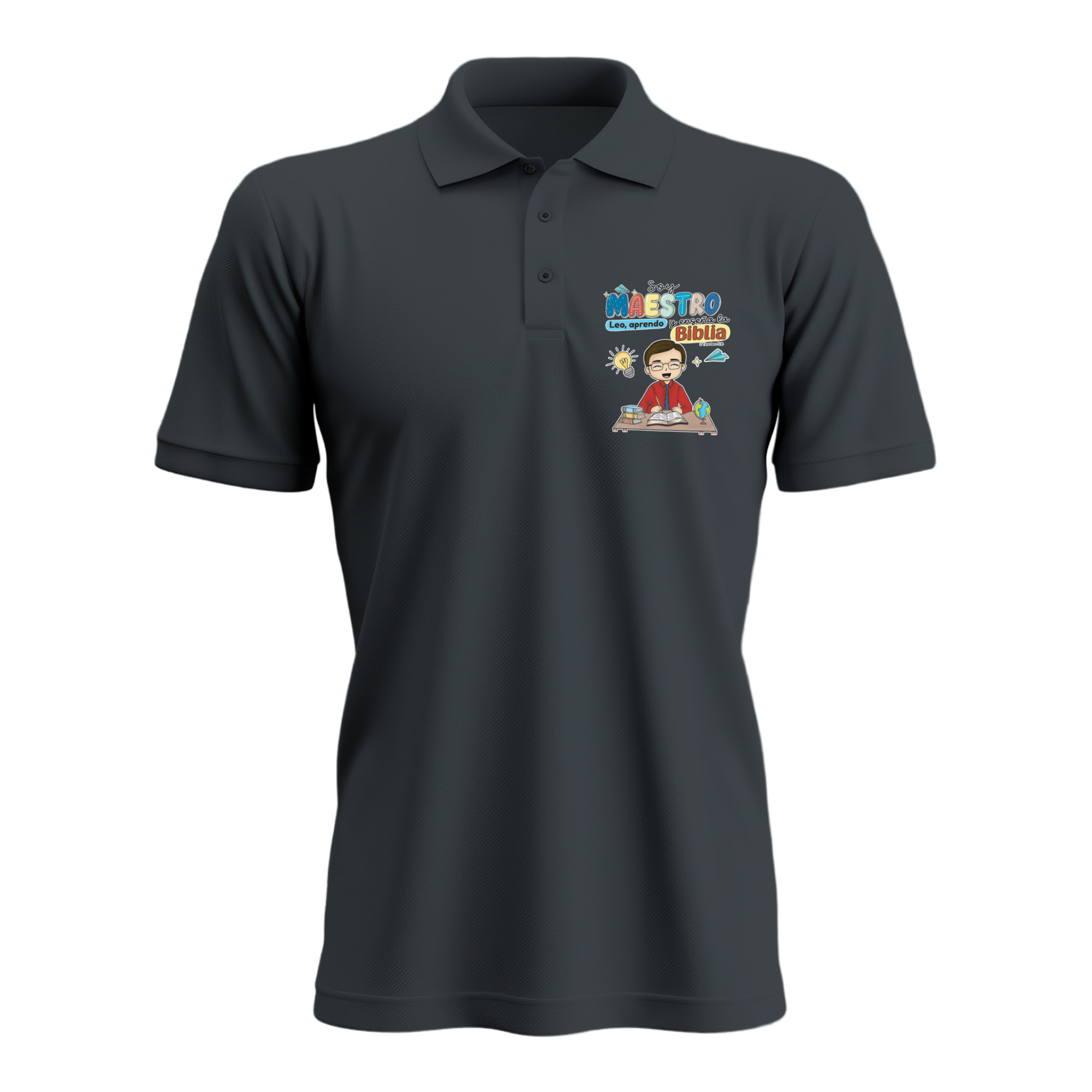 “Soy maestra, leo, aprendo y enseño la Biblia” y una ilustración de una maestra con materiales de estudio. Un diseño inspirador que refleja dedicación, pasión por la enseñanza y amor por la Palabra de Dios, ubicado en la parte izquierda del pecho.