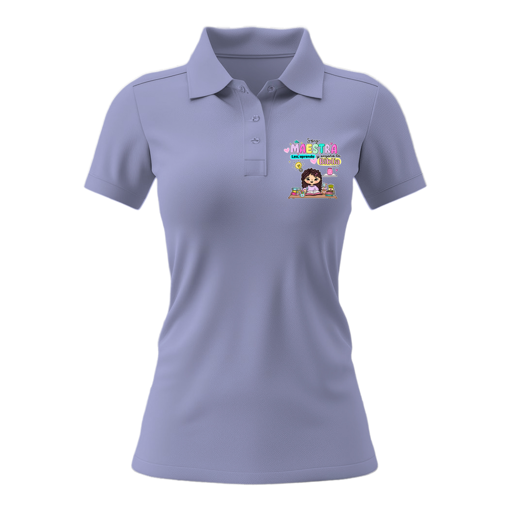 “Soy maestra, leo, aprendo y enseño la Biblia”, destacando vocación y pasión por la enseñanza. Un diseño inspirador que refleja dedicación, conocimiento y amor por la Palabra de Dios, ubicado en la parte izquierda del pecho.