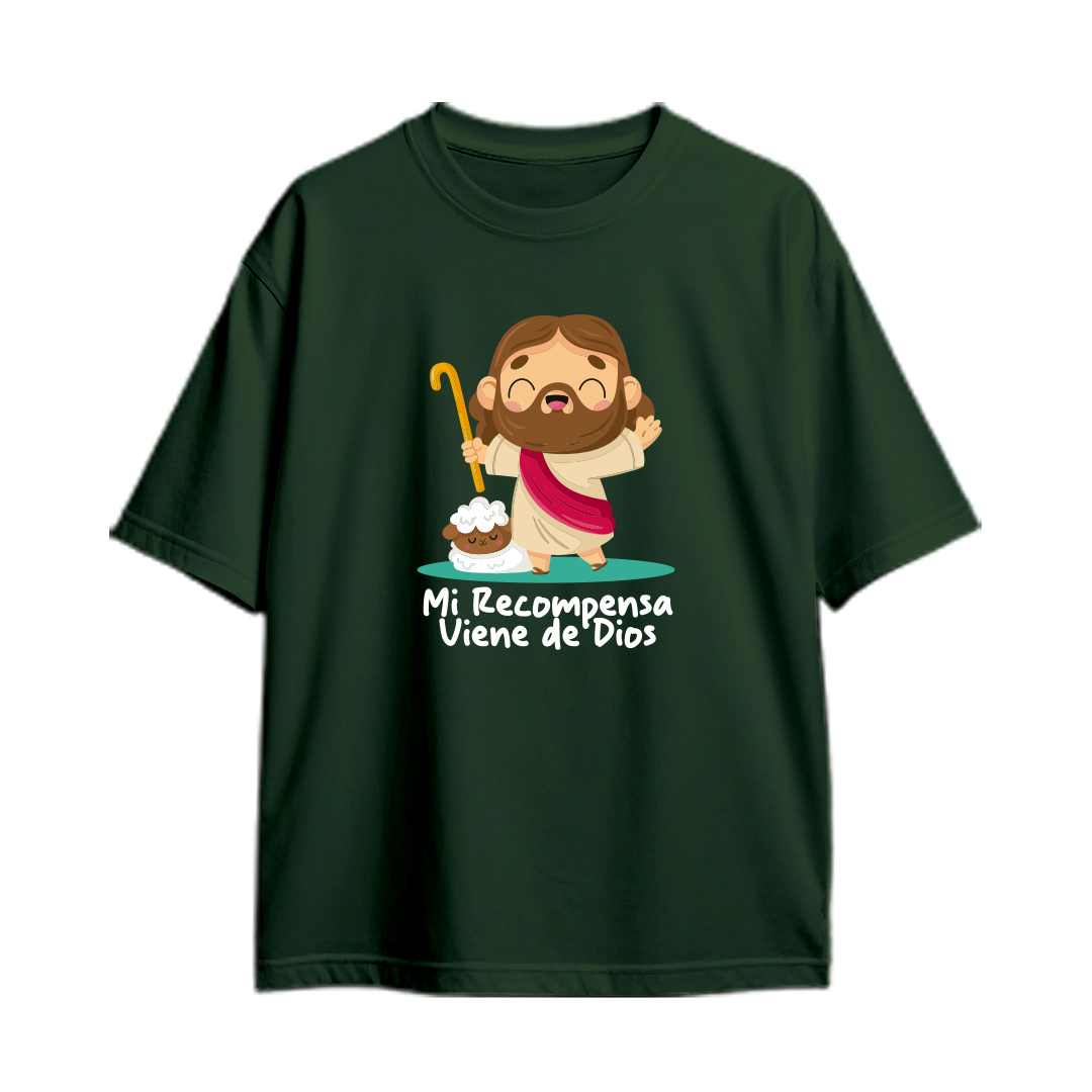 “Mi recompensa viene de Dios” acompañada de la imagen de un pastor de ovejas, símbolo de guía y cuidado divino. Un diseño tierno e inspirador que resalta la fidelidad de Dios y la paz de seguir Su dirección.